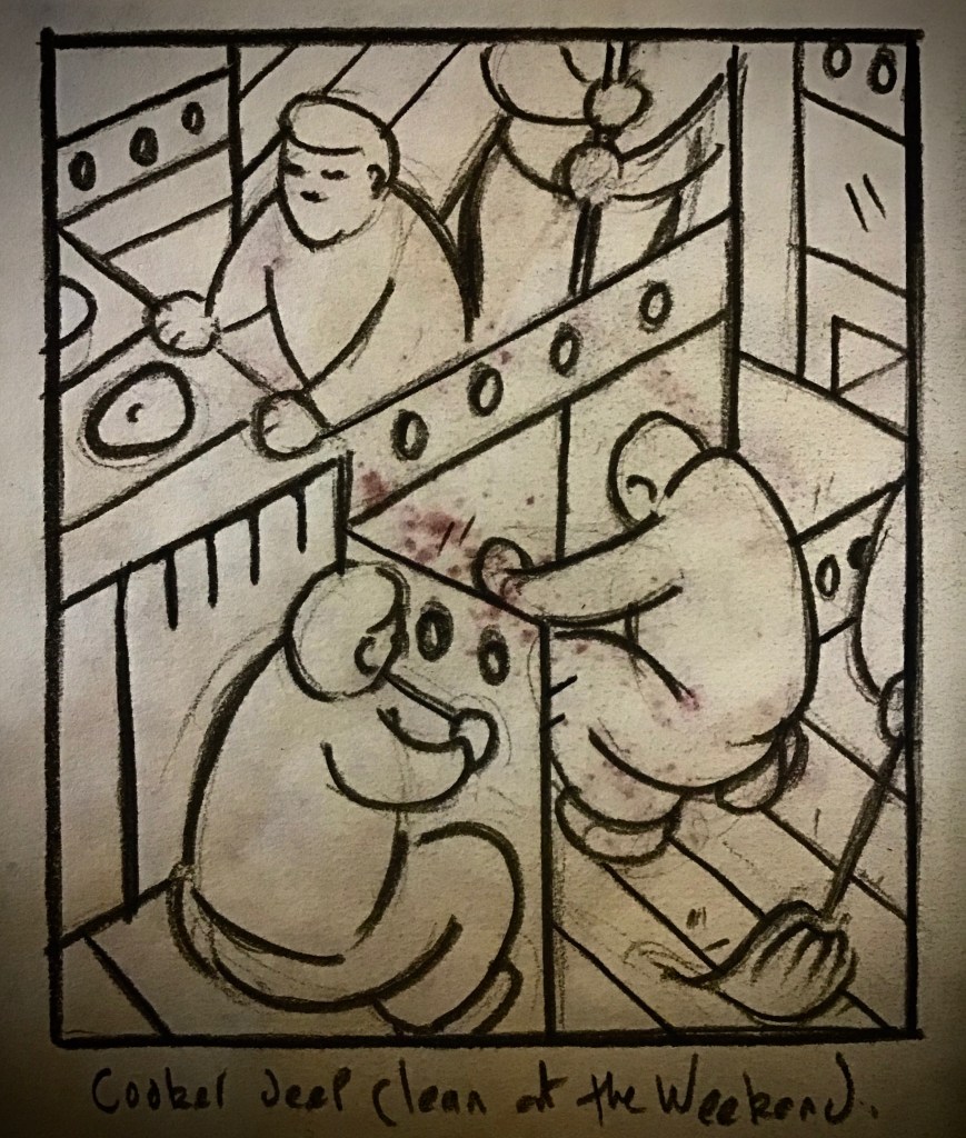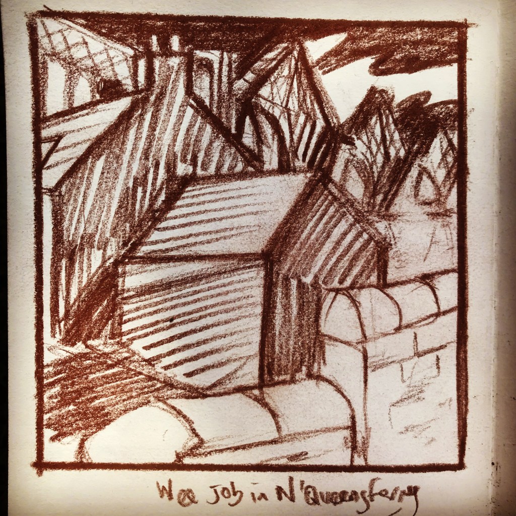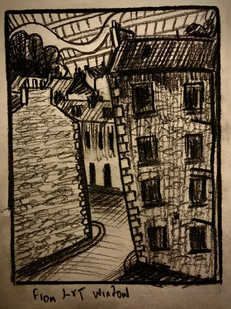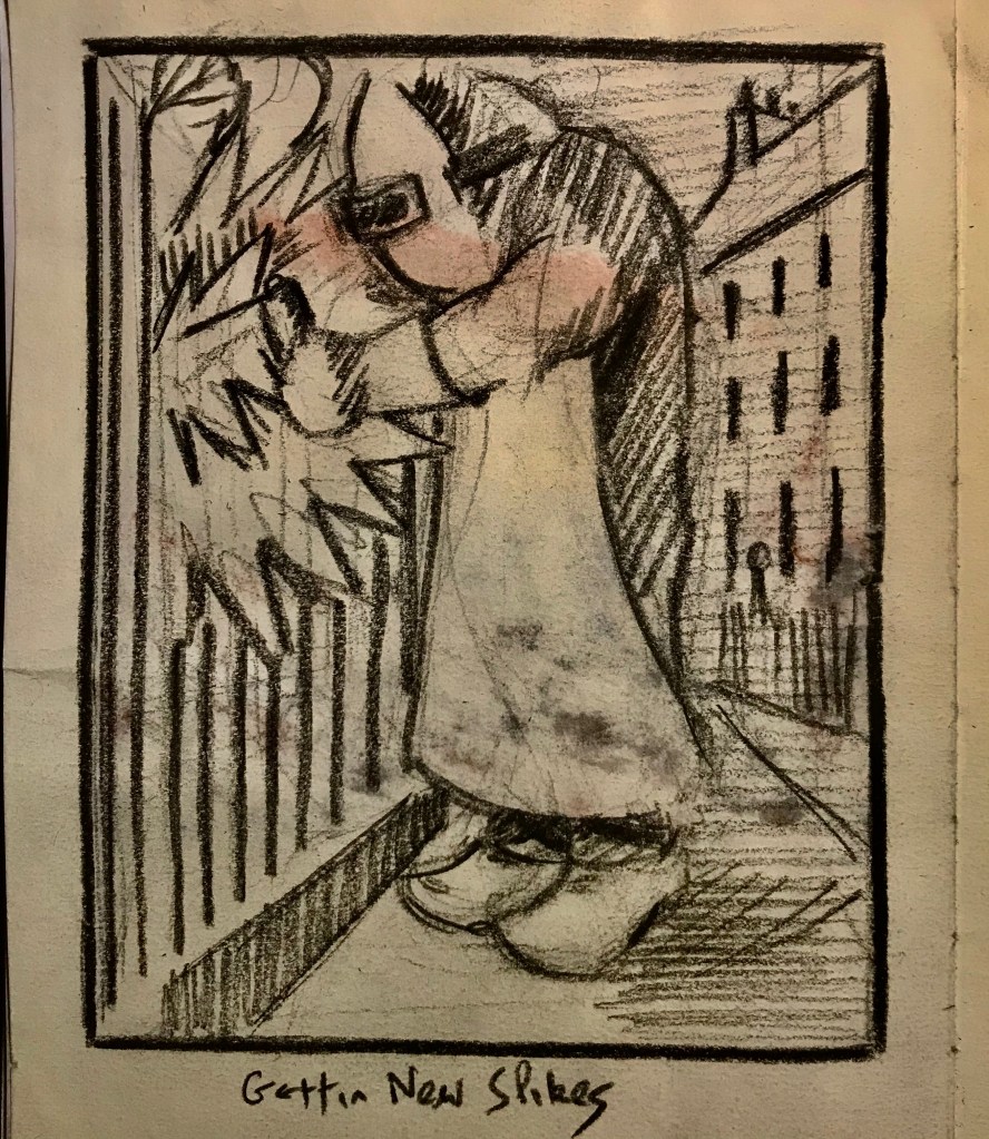 Some days were better than others. Sometimes I had a few drawings for that day and so a decision had to be made. Little surprises, when thinking about what inspires an image that I wanted to draw but didn’t feel I could but did it anyway, these some of my favourites – for example, the wee man welding the railings in Drummond Place who somehow managed to be wearing clogs in the image…I don’t know why…but l liked it.