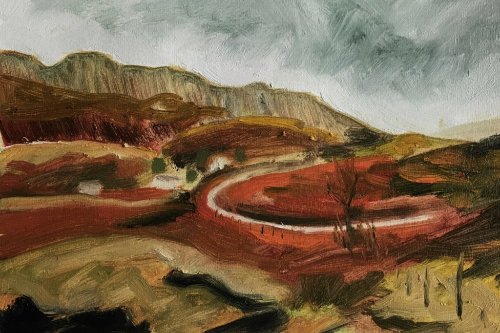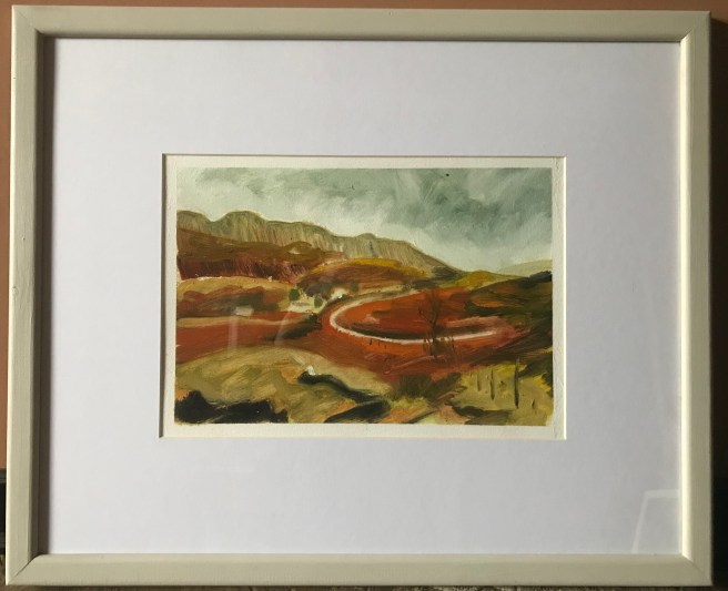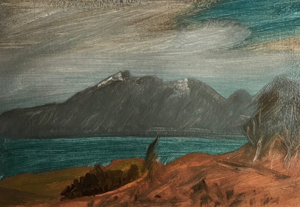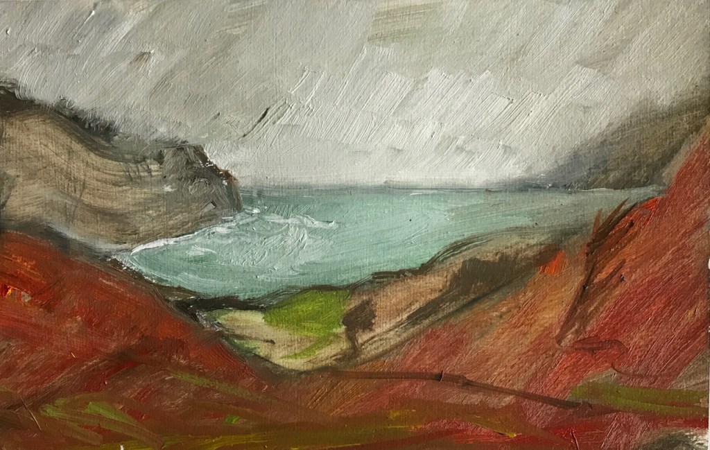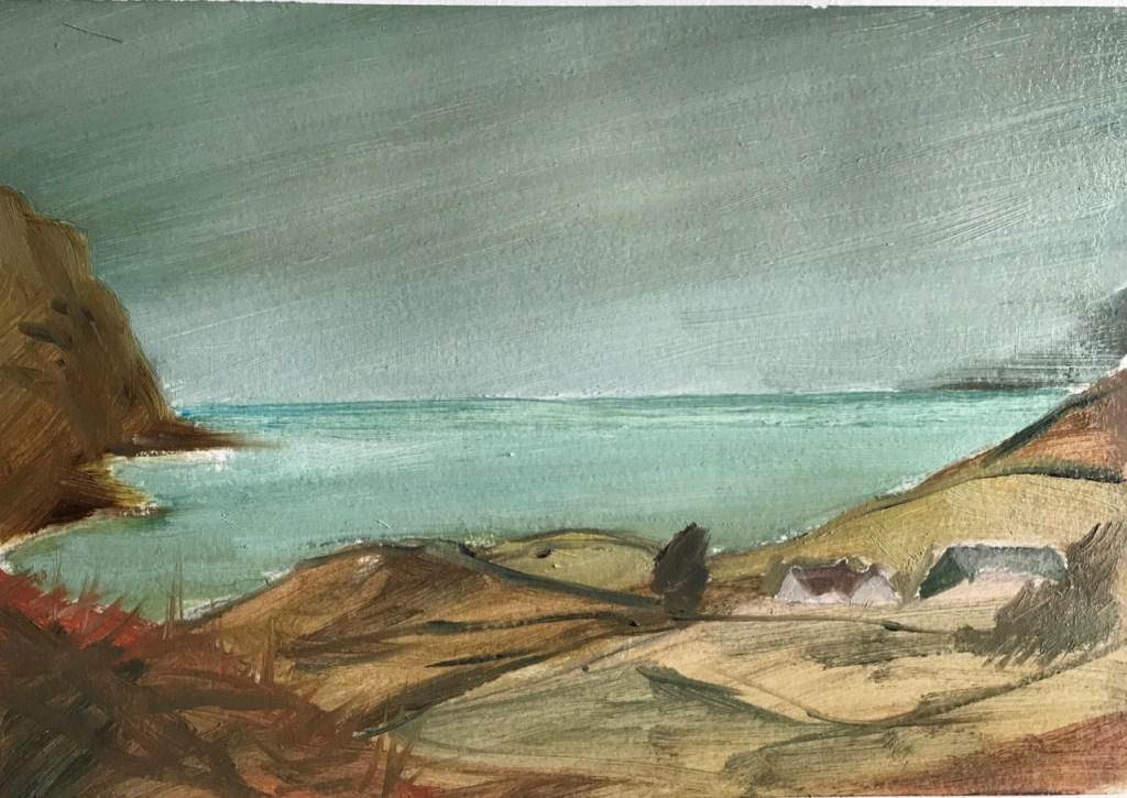 I made my way around the island during the week in the teeth of Storm Ciara, taking many photographs and making sketches. In the evening I wrote up an illustrated journal and painted nine small oil paintings on paper from the window of Sweeney’s, watching the weather batter the island and the bothy.