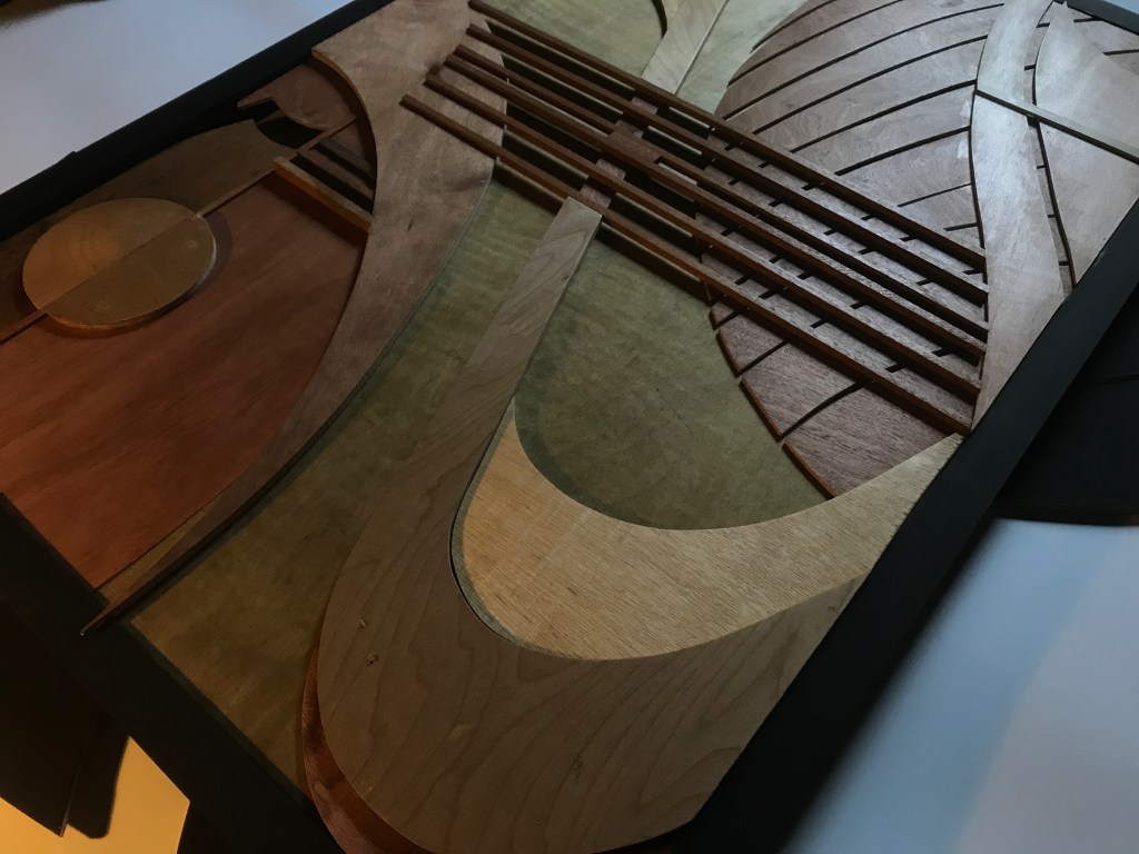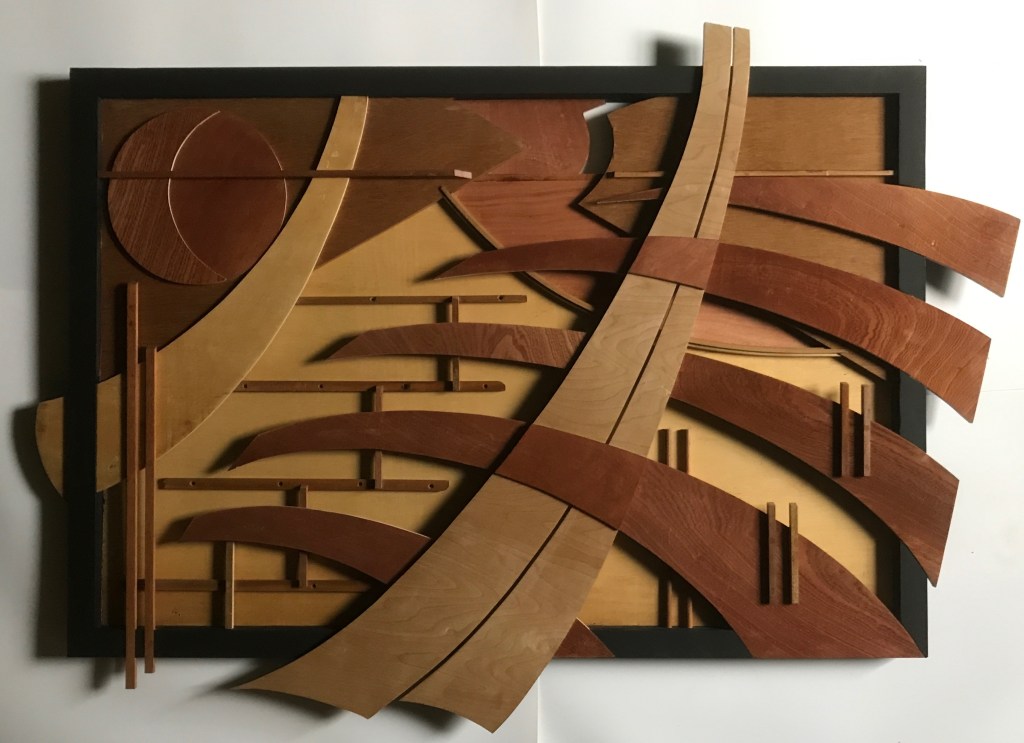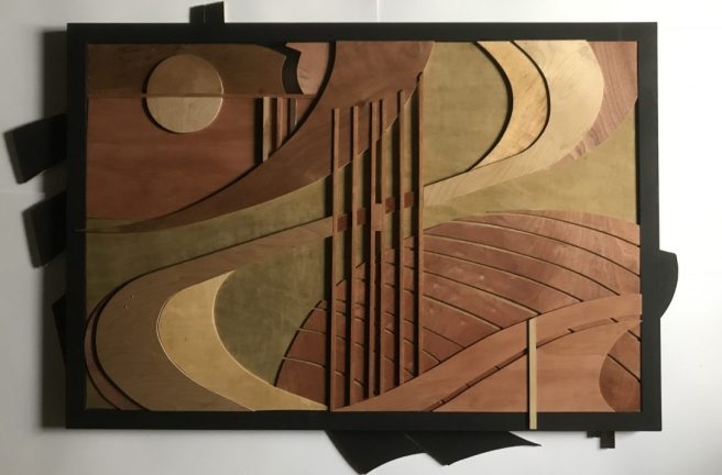 ‘Seaweed Gatherers’ Relief in plywood and mahogany in painted redwood frame.