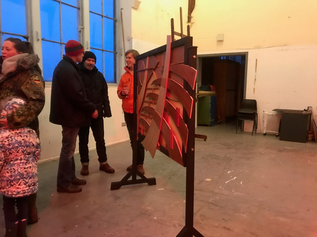 Displaying the work was more of a challenge when it became clear that the logistics of hanging the work from the rafters was more difficult than originally thought. Fortunately I had constructed a stand as a back-up plan but did not have the same effect as intended.